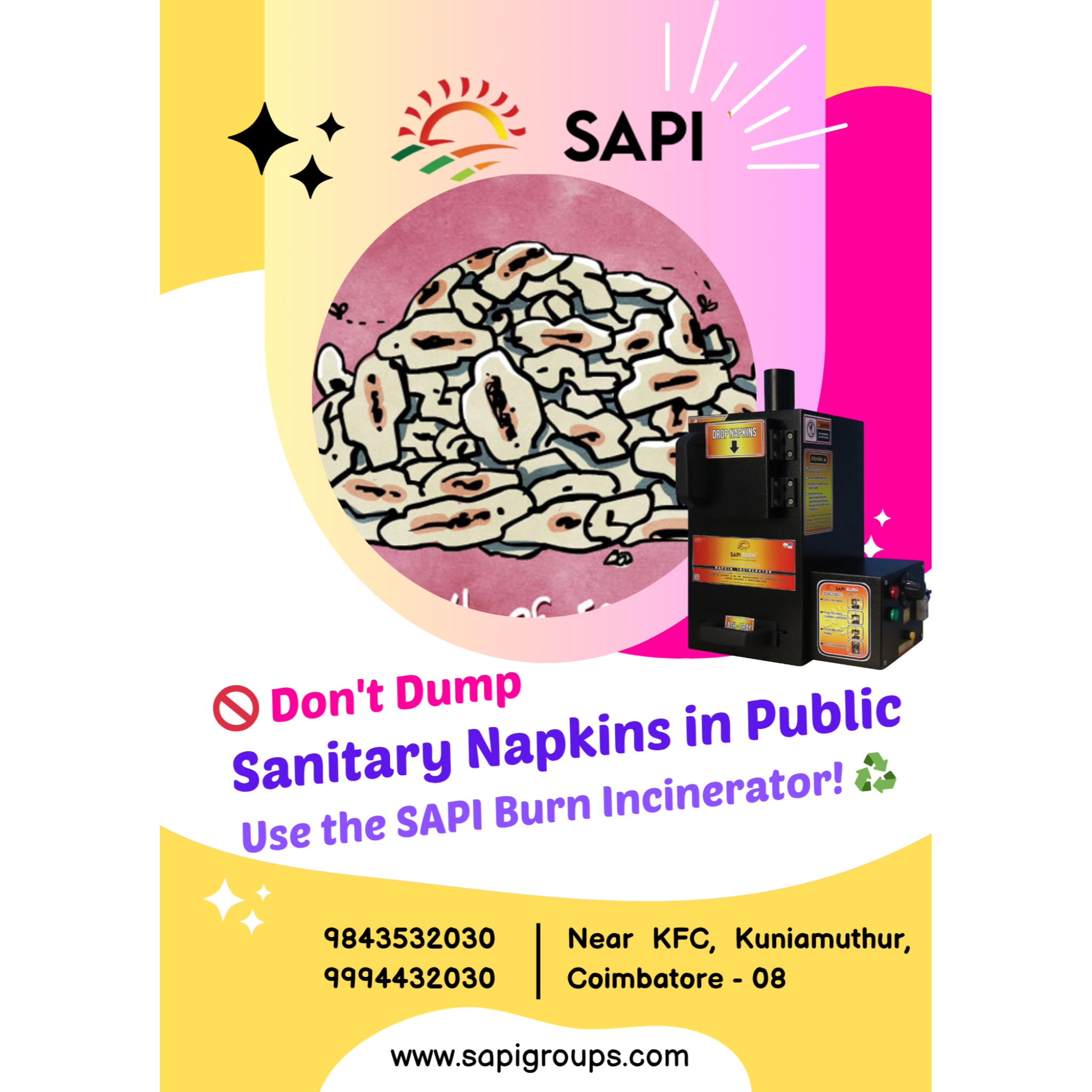 Improper disposal leads to unhygienic conditions and environmental pollution. Maintain cleanliness and dignity by using a safe disposal method. Use the SAPI BURN Incinerator for hygienic and eco-friendly disposal of sanitary waste. Designed for schools, offices, and public spaces, it ensures cleanliness, safety, and convenience. Serving across South India: Coimbatore, Chennai, Madurai, Trichy, Salem, Erode, Tiruppur, Tirunelveli, Vellore, Thanjavur, Karur, Dindigul, Namakkal, Hosur, Nagercoil, Bengaluru, Mysuru, Kochi, Thiruvananthapuram, Hyderabad, Vijayawada Make the right choice for a cleaner environment. For more details: 9843532030 9994432030 Near KFC, Kuniamuthur, Coimbatore - 08 www.sapigroups.com