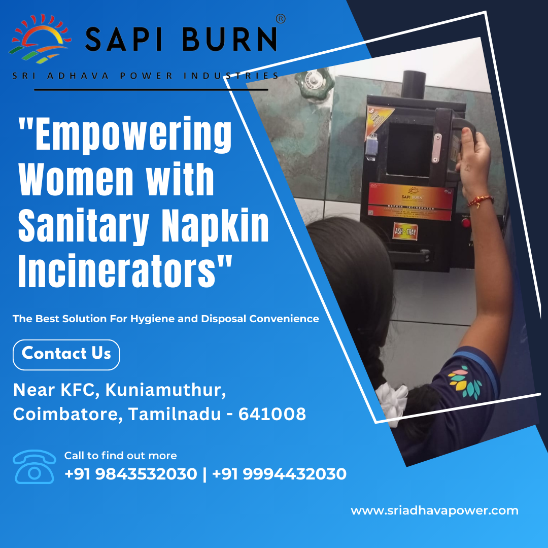 Proper disposal of sanitary napkins is essential for maintaining hygiene and a clean environment in restrooms. SAPI BURN Sanitary Napkin Incinerator from Sri Adhava Power Industries offers a safe and efficient solution for disposing of used sanitary napkins in schools, colleges, offices, hospitals, hostels, and public facilities. Designed for reliability and easy operation, the SAPI BURN incinerator helps reduce waste, control odor, and promote better menstrual hygiene management. It supports institutions in creating a hygienic and dignified environment for women and girl students. Trusted installations are available across many cities in Tamil Nadu and Kerala including Coimbatore, Chennai, Madurai, Tiruchirappalli, Salem, Erode, Tiruppur, Vellore, Tirunelveli, Thanjavur, Nagercoil, Kochi, Thiruvananthapuram, Kozhikode, Thrissur, Palakkad, Kollam, Alappuzha, Kannur, and Kottayam. For enquiries and orders: Sri Adhava Power Industries 452, Thirunavukkarasu Nagar, Near KFC, Kuniamuthur, Coimbatore – 641008 Phone: +91 98435 32030 | +91 99944 32030 Website: www.sriadhavapower.com
